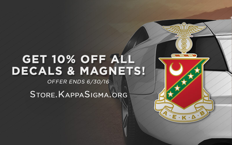 The Kappa Sigma store is offering 10% off all car decals and magnets during the month of June! So whether you’re just looking to add some small and subtle letters to your window or want to go all-out with a “Super Large Crest” magnet, the Kappa Sigma store has what you’re looking for.