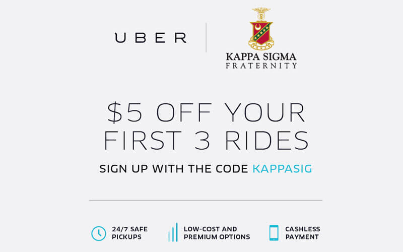 UBER has offered a special discount to all Kappa Sigma Brothers for $5 dollars off the first three rides. Those Brothers who sign up to use the service, and who wish to receive this special discount, may do so by using the special promo code KAPPASIG.