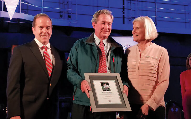 U.S. Sailing has honored Chesapeake Region Accessible Boating (C.R.A.B.) with the 2019 Robie Pierce Award for its efforts over 30 years to promote public access sailing for thousands of people with disabilities. The award was presented by Robbie Pierce, the son of the award’s namesake, and US Sailing President Cory Sertl to C.R.A.B. Executive Director Paul “Bo” Bollinger at U.S. Sailing’s Leadership Conference awards ceremony on the deck of the aircraft carrier U.S.S. Midway in San Diego, California. Brother Bollinger is an initiate of the Beta-Nu Chapter at the University of Kentucky.