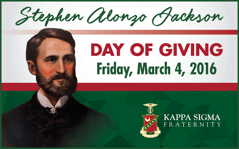 The Supreme Executive Committee and Kappa Sigma Endowment Fund announced that it would launch the first-ever STEPHEN ALONZO JACKSON DAY OF GIVING on March 4, 2016. The purpose of this historic initiative is to raise funds for each Chapter Scholarship Fund and to honor one of Kappa Sigma’s greatest brothers.