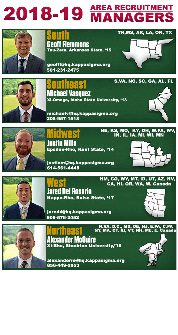 The ARMs are recent graduates who come from strong chapters and had a positive Kappa Sigma experience. That experience and knowledge from traveling their area make them a valuable resource for any chapter or colony looking for new ideas and a fresh perspective.