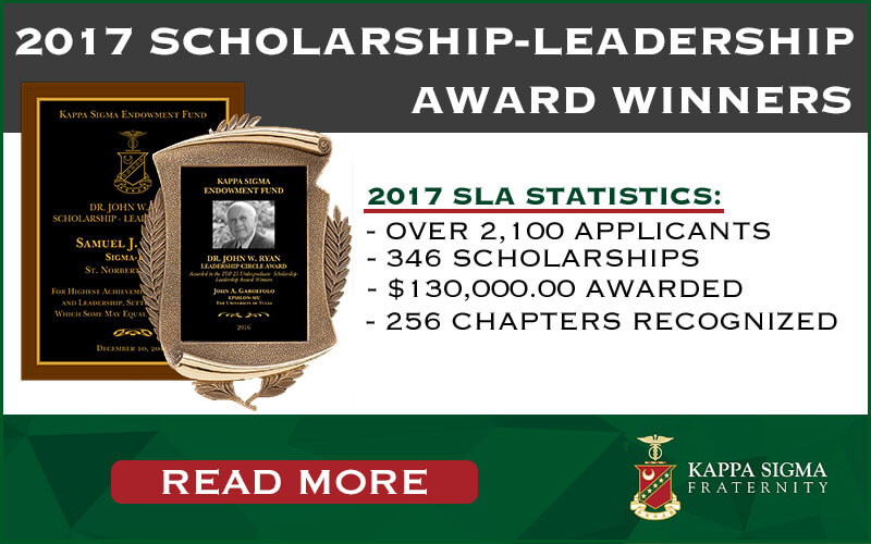 It has been an incredible year for the Kappa Sigma Endowment Fund Scholarship-Leadership Award program. Since 1947, the Endowment Fund has donated nearly $5 million to brothers demonstrating excellence in academics, campus involvement, and fraternity leadership. The 2017 Scholarship-Leadership Award Program has had an amazing year: