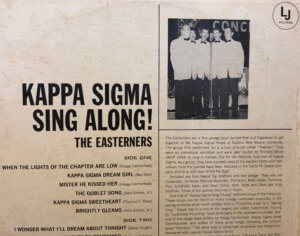 The five young men were also invited to perform at the 1965 Grand Conclave of Kappa Sigma Fraternity in Houston, Texas. Their performance was an immediate hit with all Kappa Sigma Brothers and Chapters, and a Kappa Sigma Sing A Long album was produced that undergraduate Brothers and Chapters and Alumni purchased throughout North America. The album was played in chapter houses, at Kappa Sigma gatherings and was utilized to carry the spirit of brotherhood in Kappa Sigma Fraternity both in song and melody. As a pledge of the Beta-Nu Chapter in 1977, I quickly learned the Kappa Sigma Sweetheart song, Brightly Gleams the Star and Crescent and other songs from the album. For many years that would follow, it became a staple in the chapter houses of Kappa Sigma Fraternity.