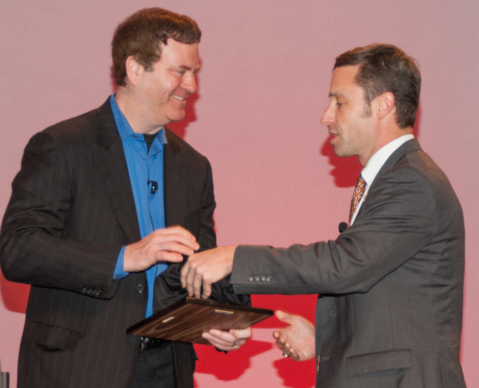Brother Wagner’s keynote address at the 2014 Leadership Conference concluded with Worthy Grand Master Hugh M. Robert (Epsilon-Mu, University of Tulsa, ‘95) presenting Brother Todd Wagner with the fraternity’s Diamond Crest recognition pin for McCormick’s Circle, which recognizes brothers who have given over $100,000 to the Order. Brother Wagner’s McCormick’s Circle pin was given for donations prior to his $100,000 gift announced at the Leadership Conference.