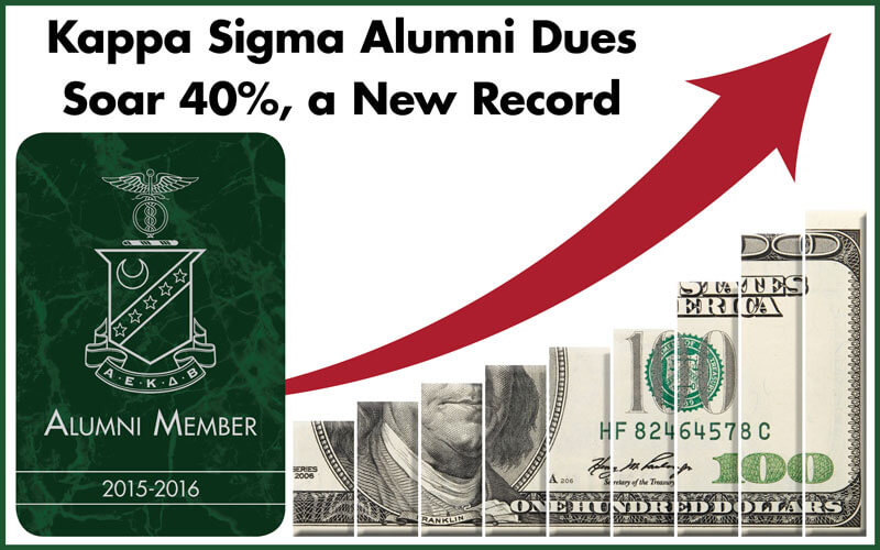 The Supreme Executive Committee and Kappa Sigma Endowment Fund announced today that 2015-16 Alumni Dues giving has increased a record 40%, topping the best year ever in Kappa Sigma history.