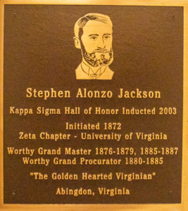 Brother Stephen Alonzo Jackson remains the most significant initiate in the history of the Kappa Sigma Fraternity. Brother Jackson was the architect of the Kappa Sigma Fraternity and was responsible for the creation of the Constitution, By-Laws and Rules, the Ritual of Kappa Sigma Fraternity, and the early expansion of Kappa Sigma to chapters which formed the foundation of the Kappa Sigma Fraternity in its infancy.
