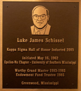 By profession, he was a judge and an attorney in Greenwood, Mississippi. Brother Schissel’s son Luke James Schissel, Jr. was the Model Initiate of Kappa Sigma Fraternity at the 1989 Grand Conclave in Orlando, Florida. Brother Schissel was a visionary for the Kappa Sigma Fraternity and provided significant leadership in the modern-day growth and development of the Kappa Sigma Fraternity. He wore Jackson’s Men Pin #1.