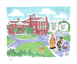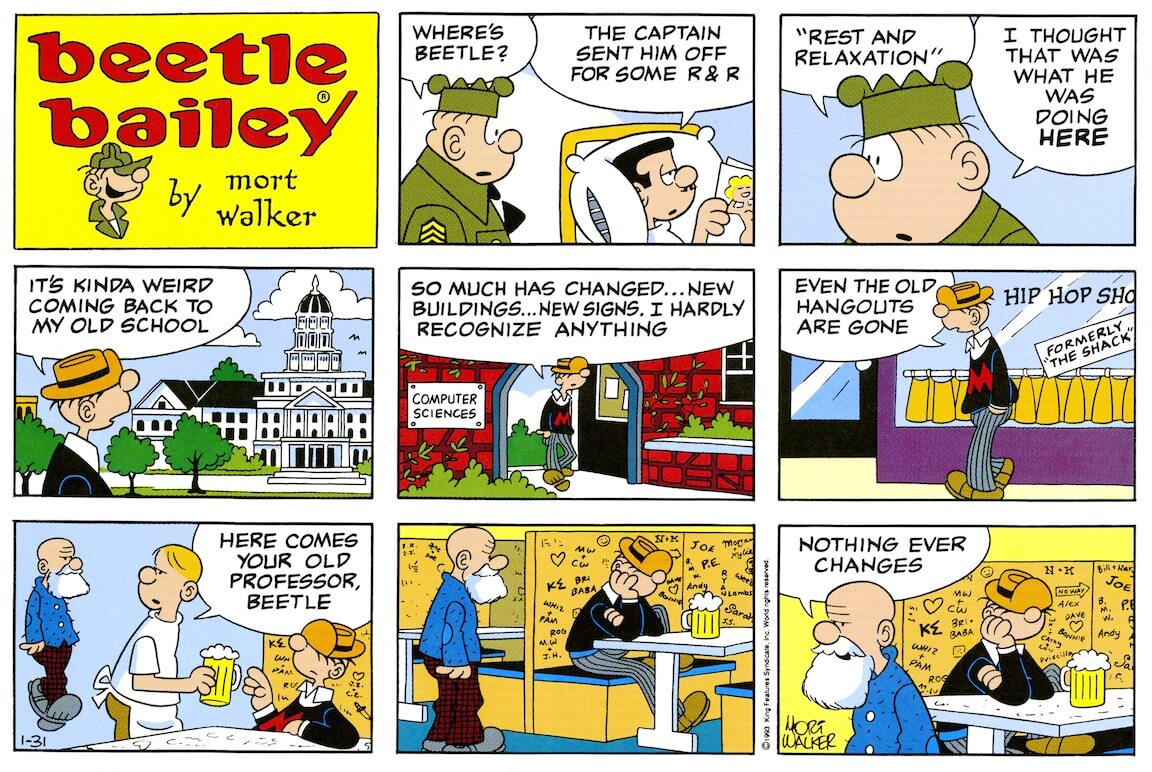 During his time at the University, he was said to be a regular at the local burger restaurant “The Shack,” which he mentioned and replicated frequently in his “Beetle Bailey” comic strip. Walker visited the Shack on return trips to the University with the last being to the original structure in 1978.