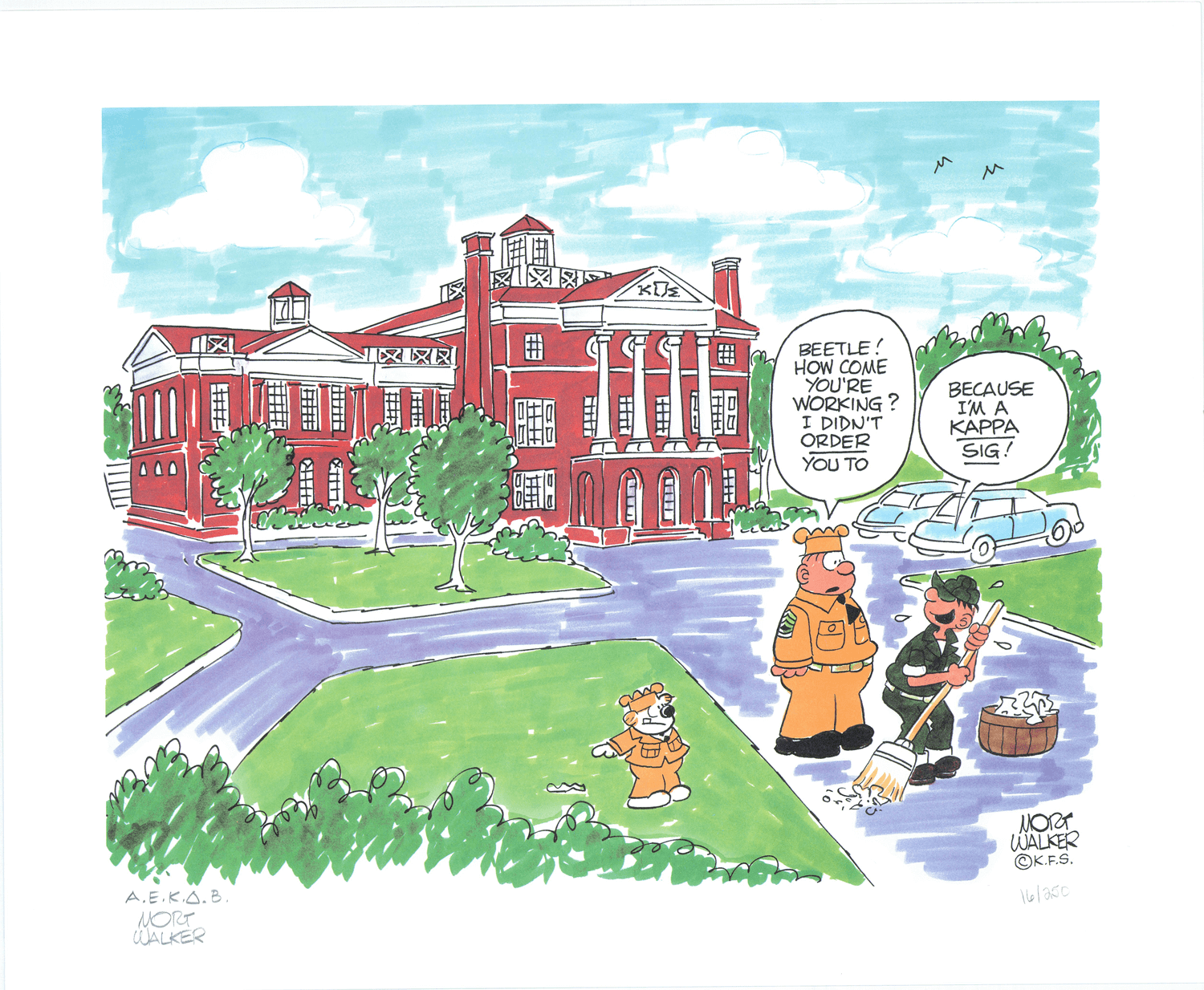 In 1942 he started attending the University of Missouri, where he became an initiate of the Beta-Gamma Chapter. In 1943, Walker was drafted into the Army and served in Italy, where he was an intelligence and investigating officer. After the war, he was posted to Italy where he was in charge of an Italian guard company. He was discharged as a first lieutenant in 1947. He graduated in 1948 from the University of Missouri, where he was the editor and art director of the college’s humor magazine, Showme, and was president of the Beta-Gamma Chapter.