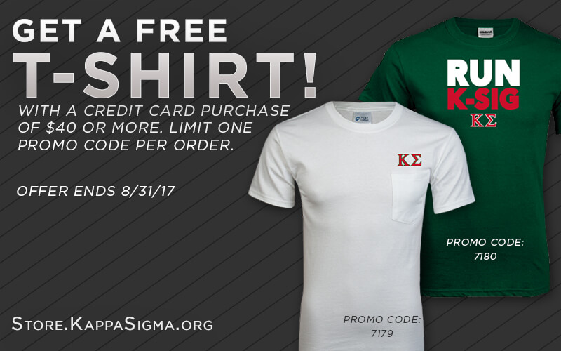 Get a free T-Shirt with this month’s awesome special! Spend $40 or more on your credit card and grab a free Kappa Sigma T-Shirt from the Official Online Kappa Sigma Store!