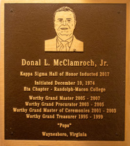 Brother Donal L. McClamroch, Jr. was initiated into the Eta Chapter at Randolph-Macon on December 10, 1974. Brother McClamroch has served the Kappa Sigma Fraternity as a volunteer alumnus since his graduation from Randolph-Macon College in 1977. His 40-years of alumni service represent one of the longest-serving volunteer officers in the history of Kappa Sigma Fraternity. Brother McClamroch served on the Supreme Executive Committee in the offices of Worthy Grand Treasurer, Worthy Grand Master of Ceremonies, Worthy Grand Procurator and as Worthy Grand Master from 1995-1999 and from 2001-2007 culminating in his election as Worthy Grand Master. Brother McClamroch was elected to the office of Worthy Grand Master at the 2007 Grand Conclave at the Doral Golf Resort and Spa in Miami, Florida.