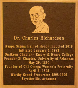 Brother Charles Richardson was a January 5, 1883 initiate of the Omikron Chapter at Emory and Henry College. Brother Richardson had the good fortune as a student at Emory and Henry to receive the tutelage of Brother Stephen Alonzo Jackson who was a mentor to the chapter throughout his Kappa Sigma career and Kappa Sigma life and who served as a role model to the brothers of the Omikron Chapter. Brother Jackson encouraged all members of the Omikron Chapter to go and found chapters of Kappa Sigma Fraternity upon their graduation from Emory and Henry College. Brother Richardson accepted that directive and after graduating from the Vanderbilt University Dental School he settled and established his profession in Fayetteville, Arkansas.