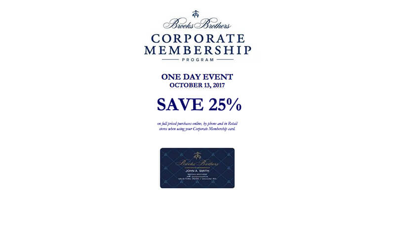 Brooks Brothers is holding a One-Day Event for all Corporate Members that will save you 25% on Friday, October 13, 2017. This is a ONE DAY EVENT and valid on full priced purchases online and by phone in US and Canadian Retail stores (Factory stores are excluded).