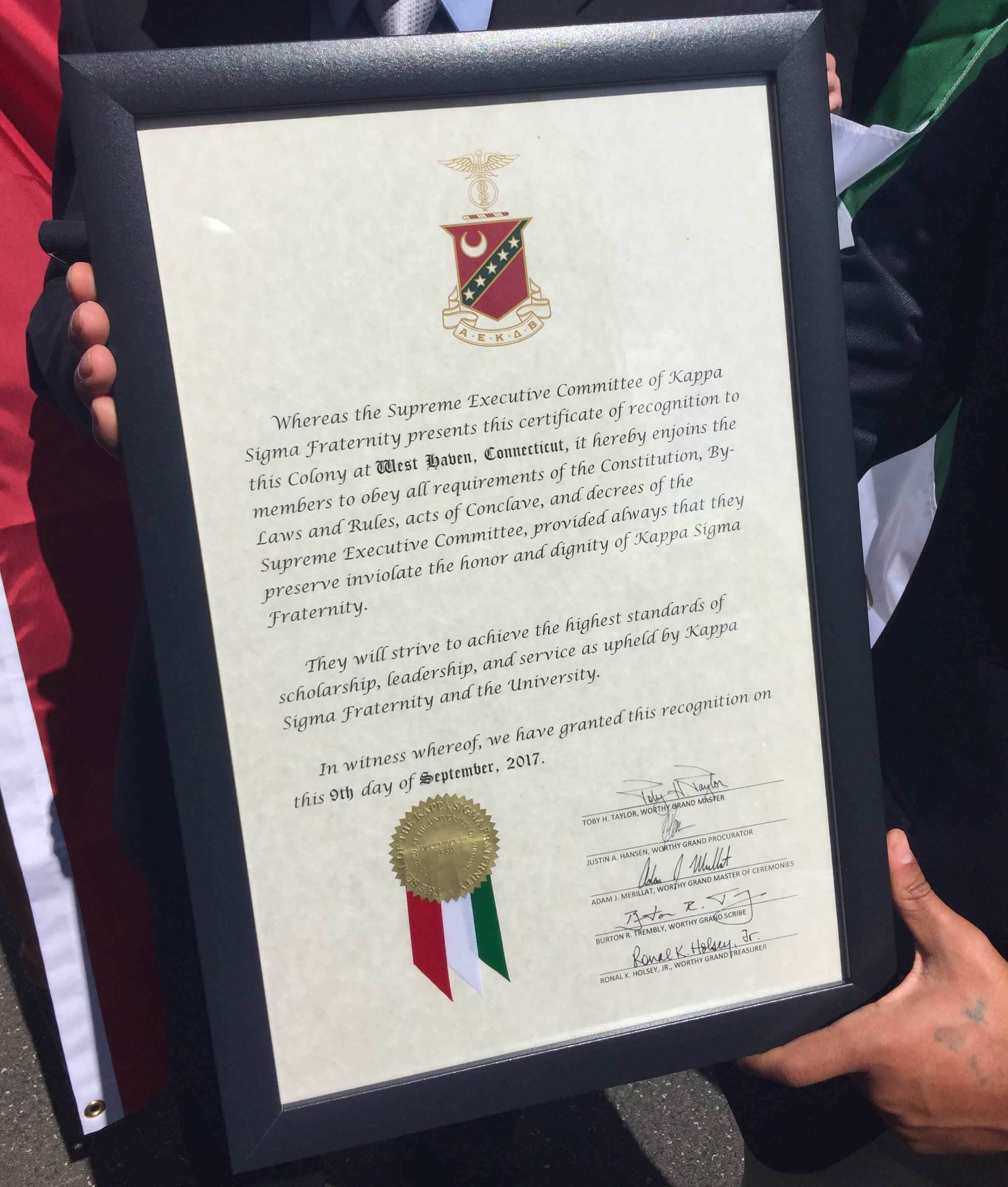 Checking out that certificate? Kappa Sigma is bringing back one of our great traditions and presenting a Colony Certificate of Recognition to all active Colonies, and the Colonies will receive their Certificate of Recognition within the coming weeks.